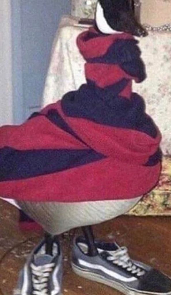The goose rocking a solid fit, but he got really big Vans. He lives in a destroyed Russian apartment because he spent all his money on that fit.